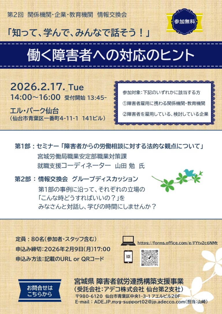 連携構築支援-81 いつもお世話になっております。 宮城県 障害者就労連携構築支援事業事務局です。 宮城県 障害者短期離職防止促進事業(委託先:雇用対策課)より「みやぎ障害者合同面接会」開催の情報共有をいた